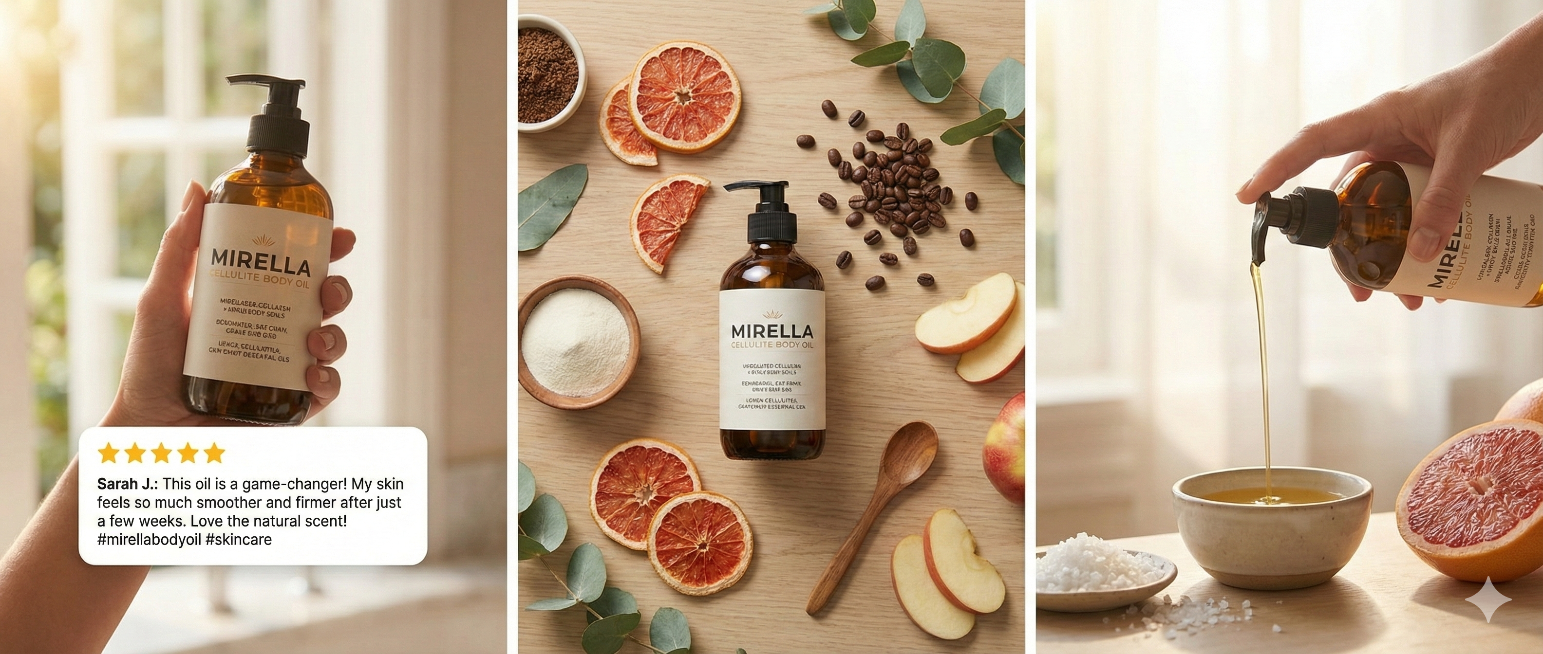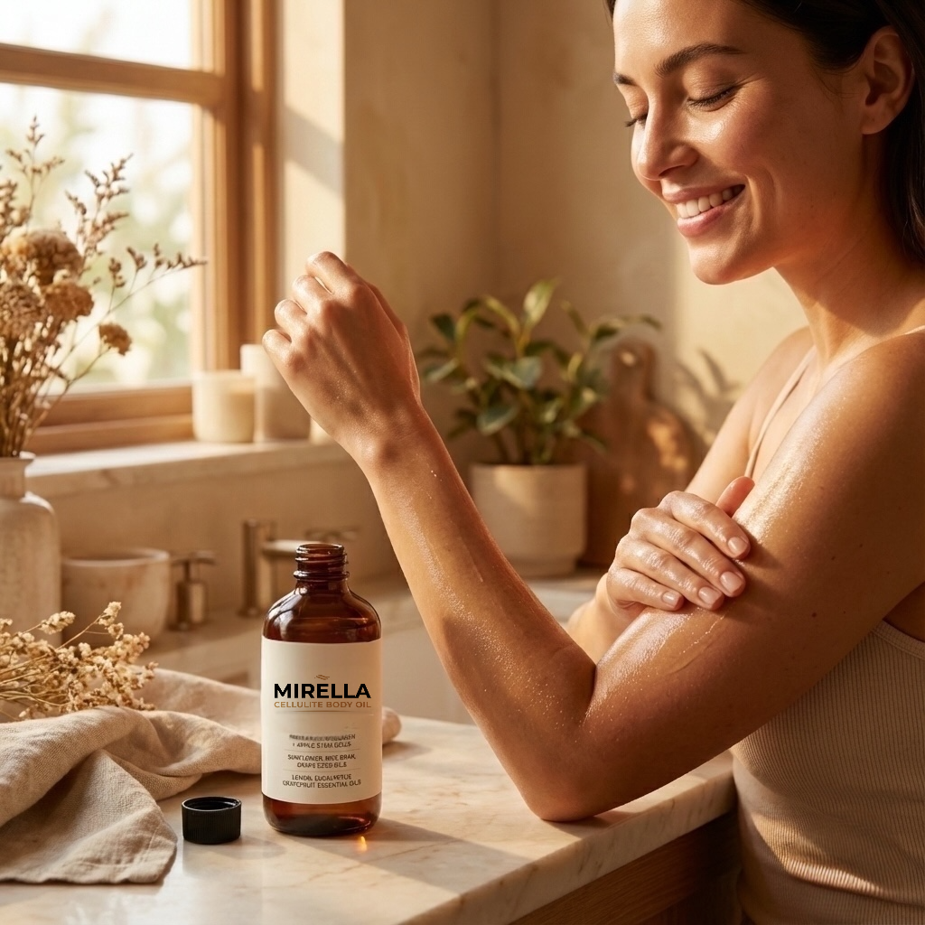 Meet MIRELLA, your new daily ritual for smoother, firmer, and more radiant skin. Our premium cellulite body oil is specifically formulated to penetrate deeply, targeting uneven texture while providing intense hydration that lasts all day.